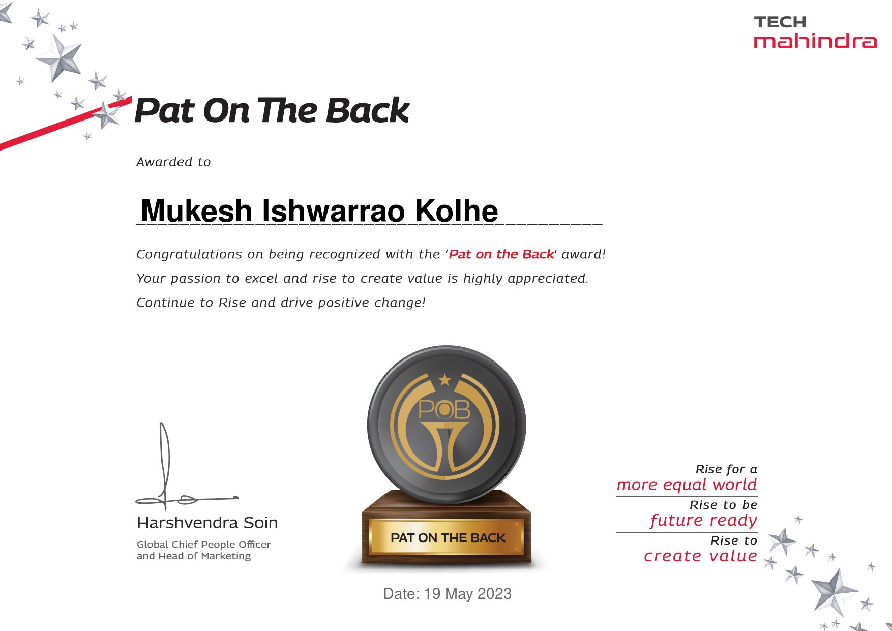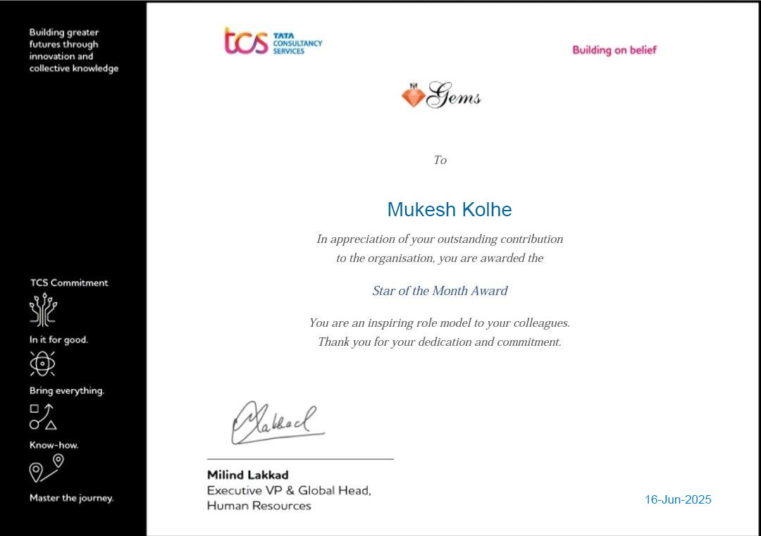 I have been awarded with the TCS Star of the Month Award in Recognition of Innovative and Intuitive Design Solutions and Exceptional On-Time Delivery