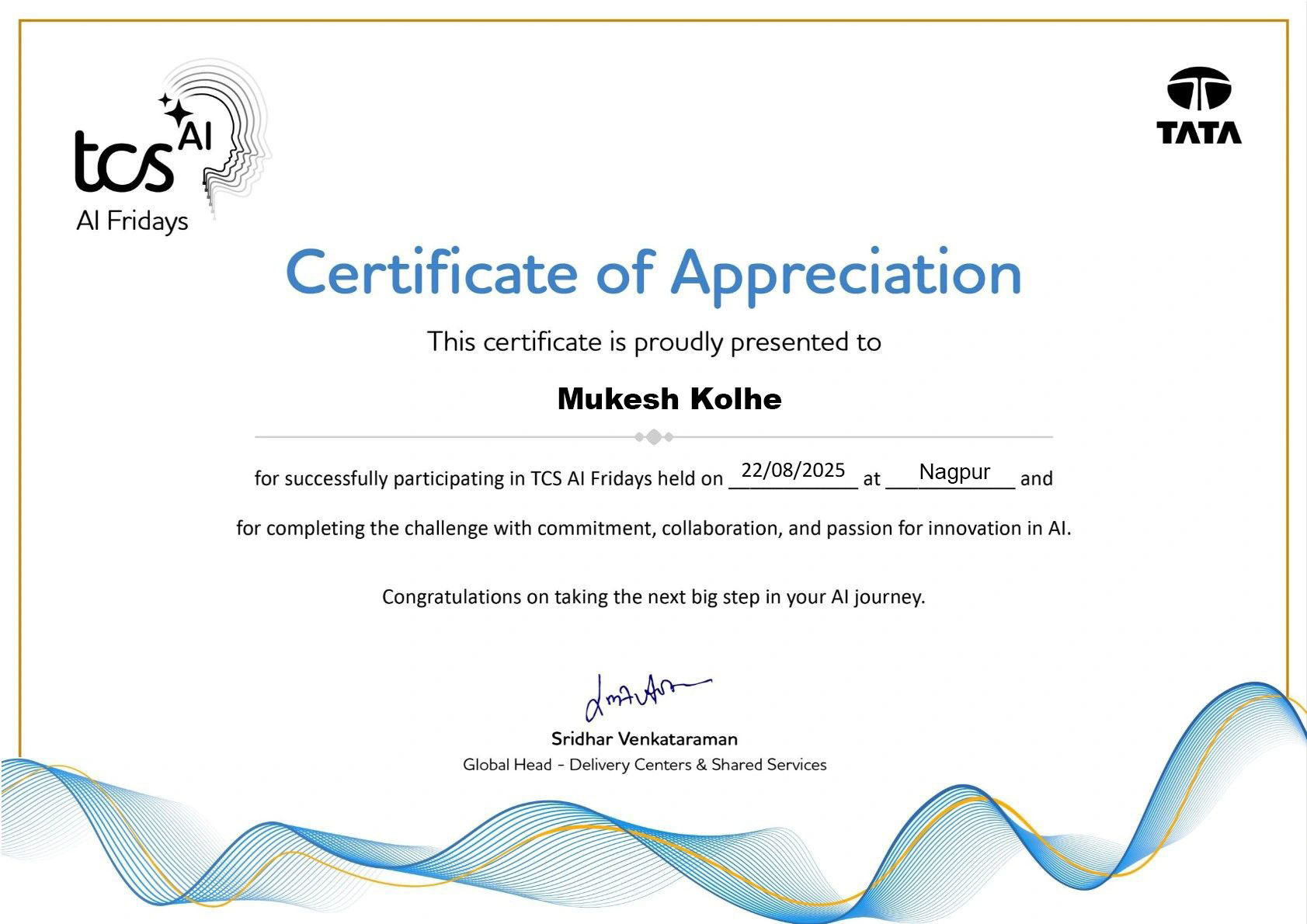 Participated in the TCS AI Friday Hackathon and received a Certificate of Appreciation for my contribution and learning during the event.